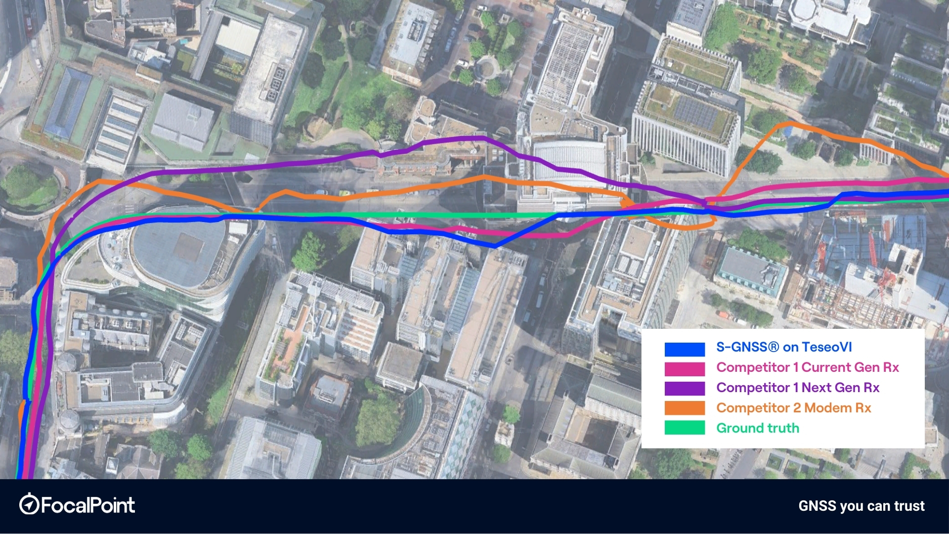 S-GNSS is integrated into STMicroelectronics’ Teseo GNSS receivers, a leading platform in the automotive market. Teseo devices are deployed in millions of vehicles worldwide and are widely recognised for their performance and reliability. Our integration combines ST’s automotive-grade GNSS hardware with Focal Point’s Supercorrelation processing, creating a joint solution aimed at delivering best-in-class urban positioning performance without requiring changes to vehicle architecture. S-GNSS operates directly at the measurement level, improving the quality of pseudorange and related signal inputs by prioritising line-of-sight signals and mitigating multipath effects. While this enhancement occurs “under the hood”, its impact is clear and visible in the position domain, as demonstrated in the results below.