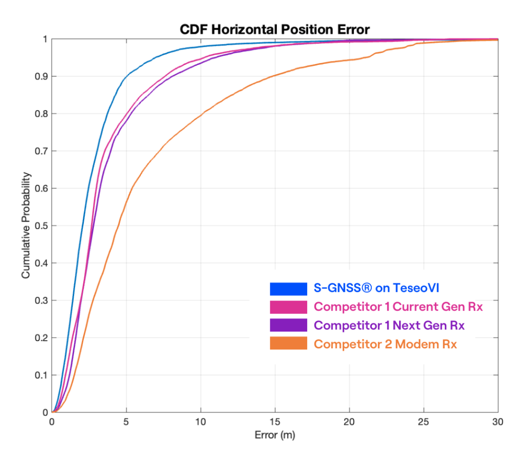 Figure 2: A Cumulative Distribution Function (CDF) chart of the Horizontal (2D) Position Error of ST Teseo+S-GNSS (blue) and 3 competitor devices (pink, purple and orange).
