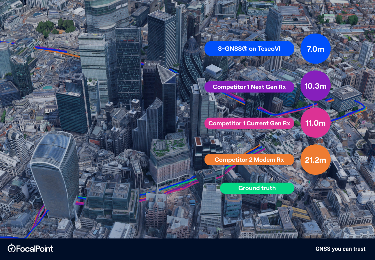 In this blog post, Jez Ellis-Gray, Product Lead at FocalPoint, presents the results of our competitive analysis comparing S-GNSS on Teseo with standard industry solutions. The cover image represents horizontal position accuracy at 95%, reflecting the numbers in Table 1.