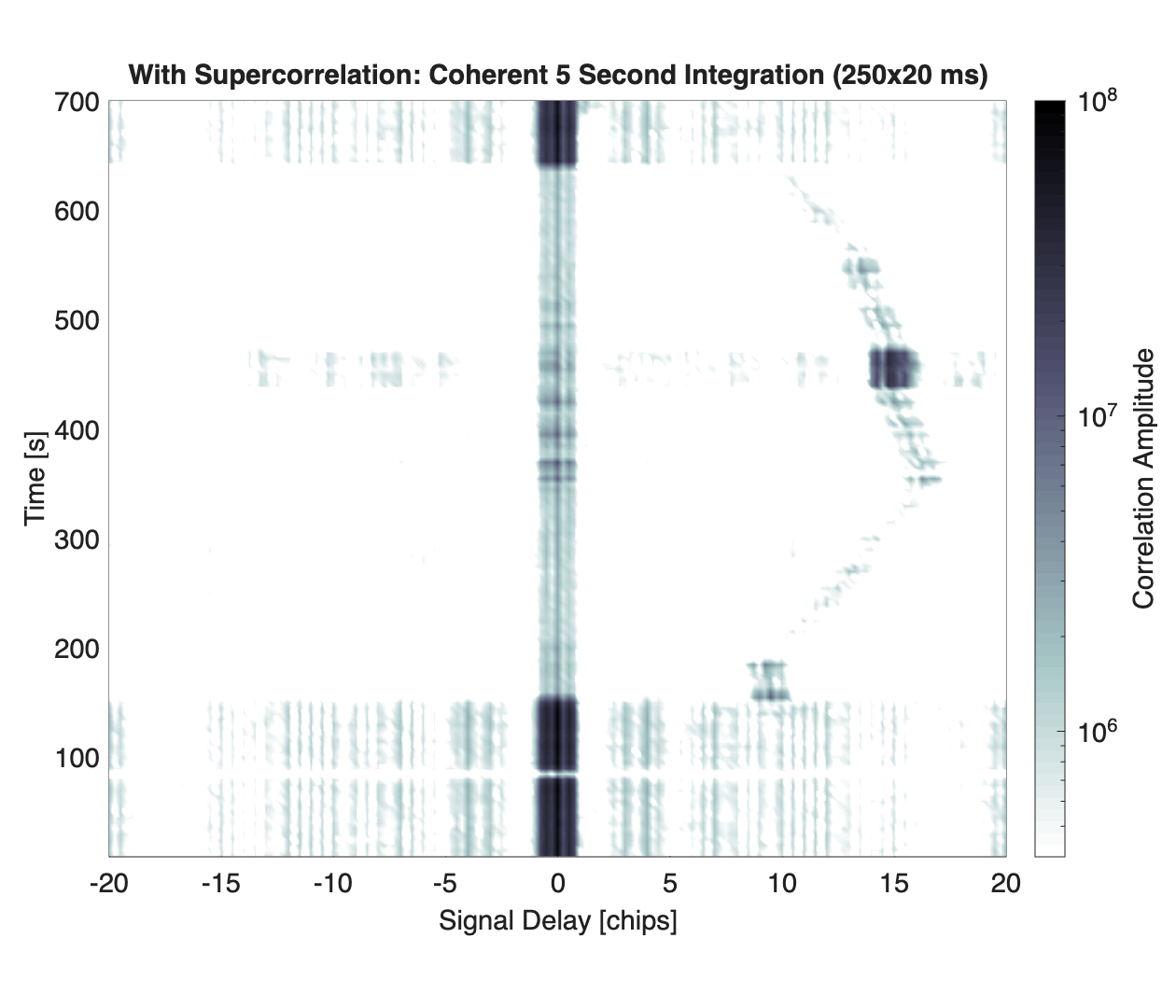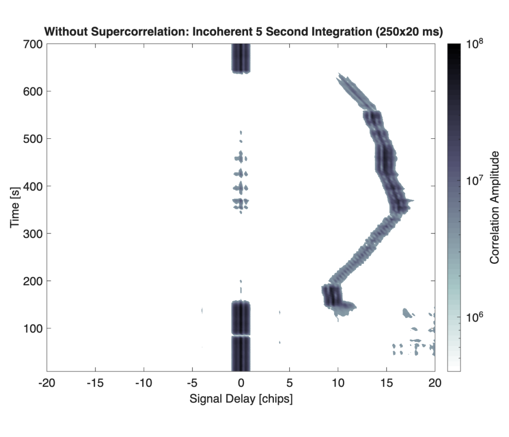 Below we show the correlation results during the full meaconing scenario for the same Galileo E1C signal; however here we have extended the integration period from 1 second to 5 seconds to further demonstrate the benefits of Supercorrelation’s motion-compensated coherent integration. In the first plot below we show the results of incoherent integration. Light to dark colours indicate low to high correlation amplitudes respectively. Strong correlation (darkest) indicates that the GNSS signal can be resolved and its time of arrival accurately measured.