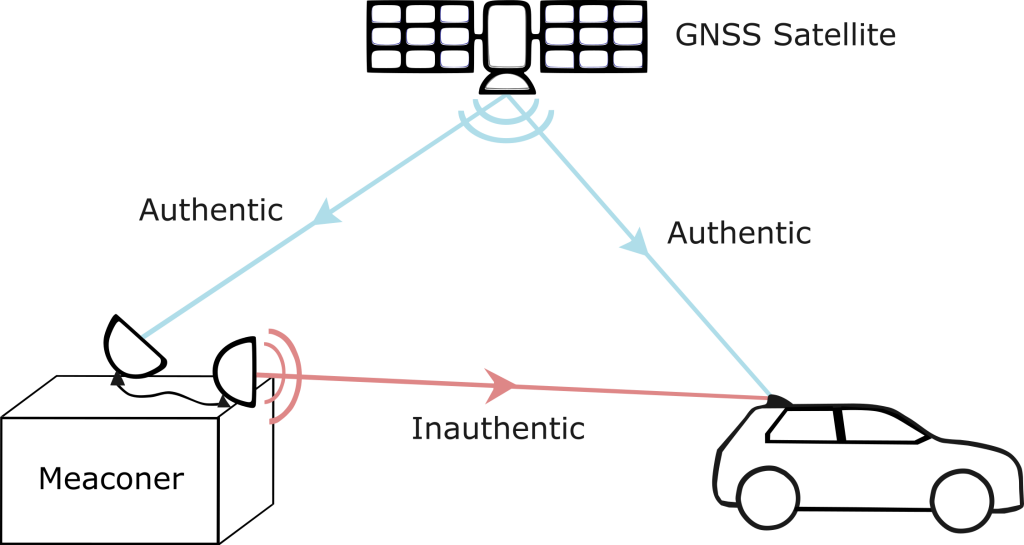 Diagram illustrating a meaconing attack. Meaconing involves the reception of authentic GNSS signals (single satellite shown for simplicity) and rebroadcasting. Spoofing is equivalent, except the inauthentic/spoofed signals are fabricated.