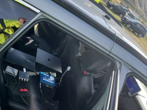 Left: test vehicle with a patch antenna at the starting location. Right: recording equipment including a LabSat GNSS recorder and reference receivers for monitoring.
