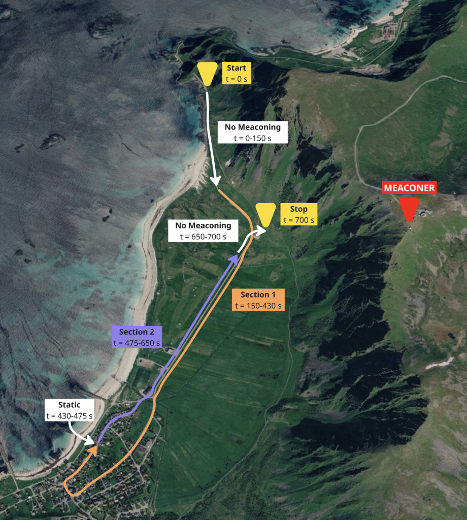 The image below shows the route driven during a specific meaconing test (Jammertest scenario 3.1.3), with the location of the meaconer shown on the mountaintop.