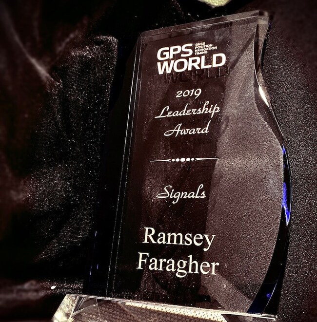 On Friday 20th September 2019 at the annual GPS World Dinner held at the Institute of Navigation GNSS+ Conference, Dr Ramsey Faragher, Founder & CEO of Focal Point Positioning was presented with the prestigious GPS World signals leadership award for their groundbreaking SuperCorrelation technology.